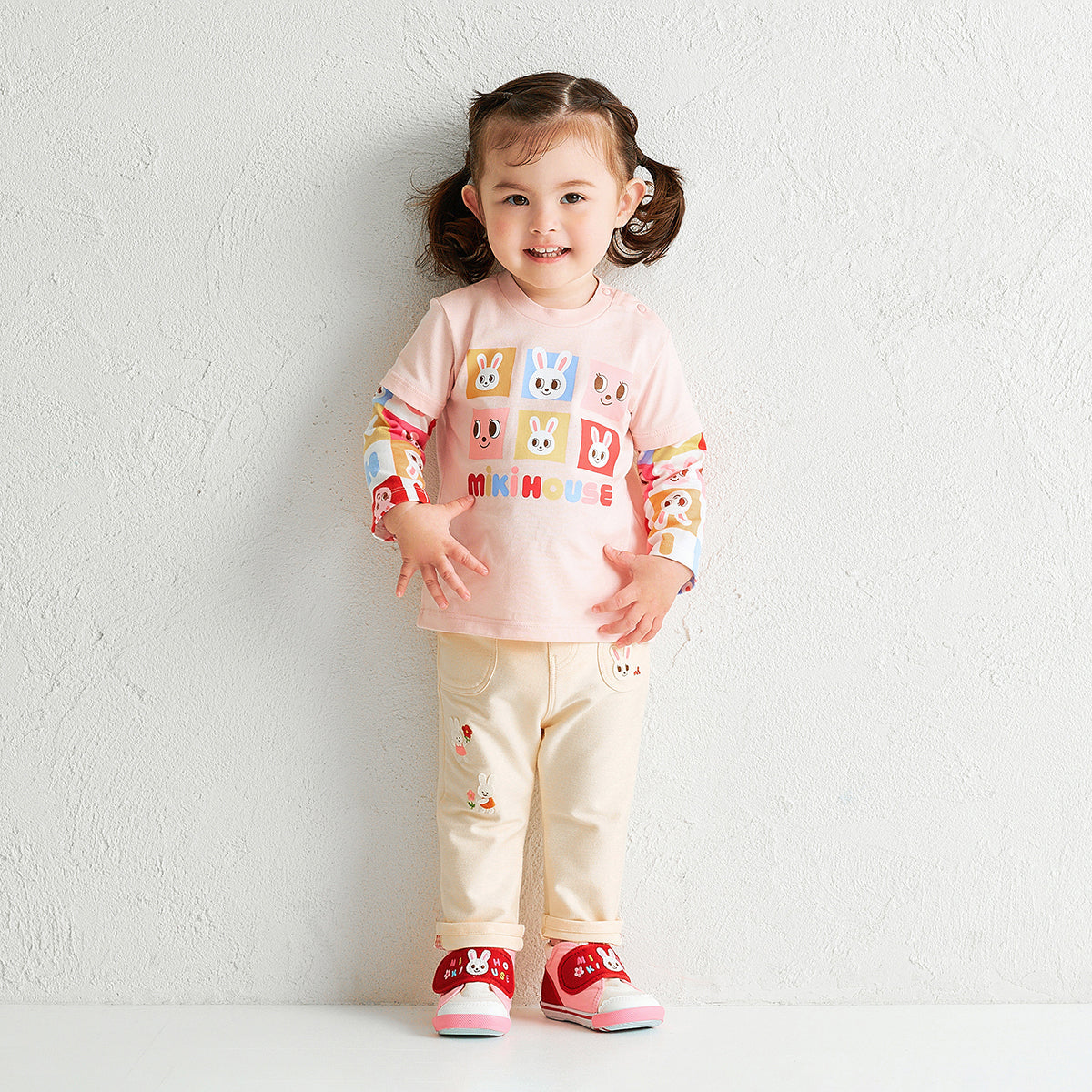 Usako and her bunny friends hoppity hop around these super stretchy denim pants that offer excellent mobility for active little ones. Coming in a stress-free fit and easy-to-coordinate hue, they’re ideal for everyday school affairs and playground endeavors alike. Roll them up in style to reveal a peek of gingham accents.