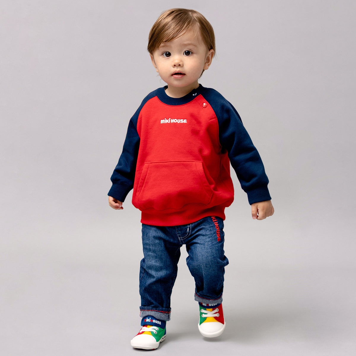 An updated take on a versatile essential from the Back Logo Collection. The sporty sweatshirt made of soft terry jersey features a kangaroo pocket and embroidered logo details in classic MIKI HOUSE colors. Coordinate into any outfit for instant coziness, or make it an active part of a thoughtful gift basket.