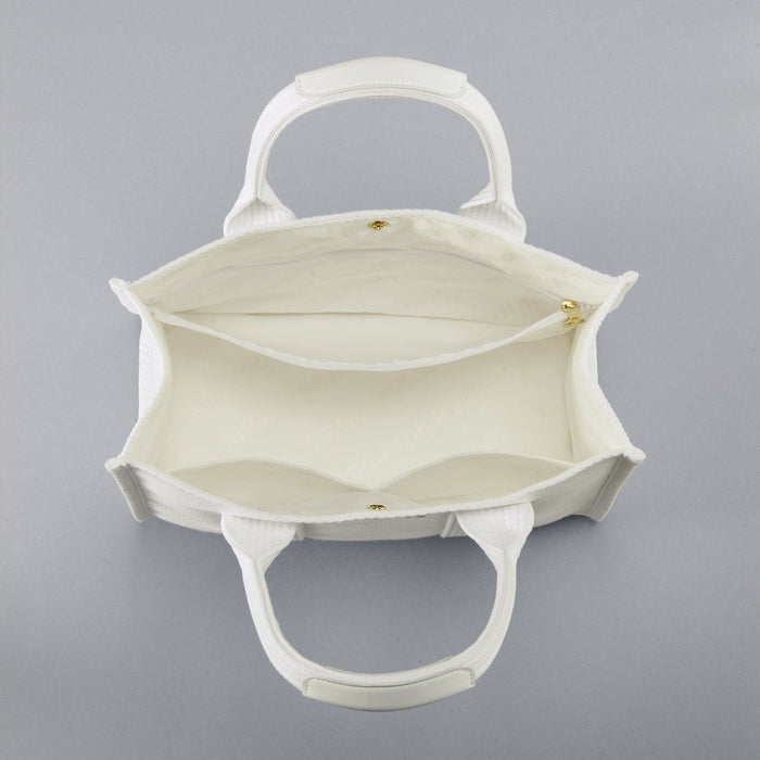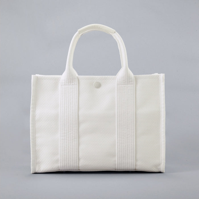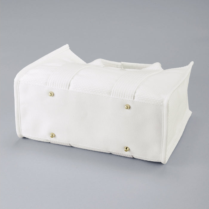 Born in the cradle of Japan’s cotton weaving tradition called Mikawa in Aichi Prefecture, this Sashiko-woven bag carries forward generations of textile artistry. Crafted from 100% Gamagori-produced Mikawa cotton, the fabric is softly structured, breathable, and naturally elegant. Its distinctive textured surface is formed by blending thicker threads into the weave, creating depth, resilience, and refined character. Gold logo embroidery adds a luminous finishing touch, while cowhide leather details strengthen areas that require durability. Complete with a secure snap closure, protective bottom studs, and organized interior compartments, this bag transitions effortlessly from everyday use to special occasions, aging gracefully with each cherished memory.