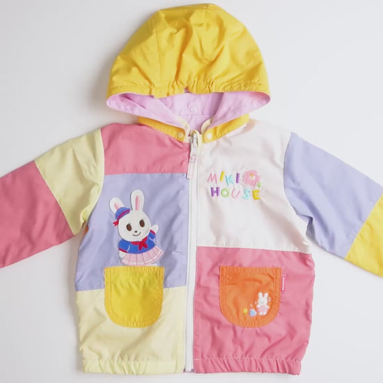 A delightful blend of spring freshness and summer whimsy, this reversible windbreaker features lively color-blocking paired with embroidered sailor Usako and nautical accents. Charming shell motifs lend a soft marine touch to the water-repellent polyester layer perfect for unpredictable and breezy spring weather. The relaxed silhouette with slightly longer proportions and detachable hood offers layering flexibility, making this joyful outerwear ideal for on-the-go fun.