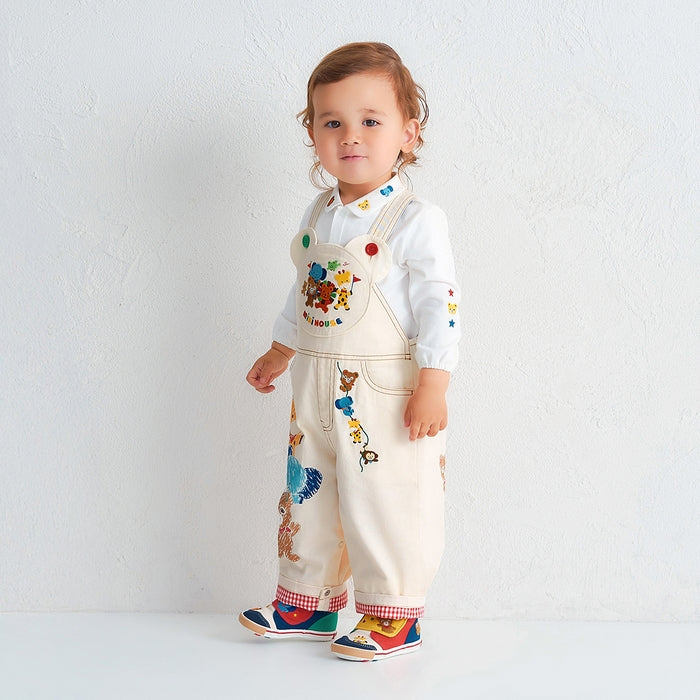 Swing into fun with these adorable overalls featuring a bear-shaped bib and lively embroidery of Pucchi and his buddies swinging on jungle vines. Hand-drawn appliqués, gingham-lined cuffs, and a Pucchi-shaped back pocket add delightful surprises at every turn. Adjustable straps and snap closures (available up to size L) make dressing a breeze, combining cuteness with everyday practicality and special outings alike.