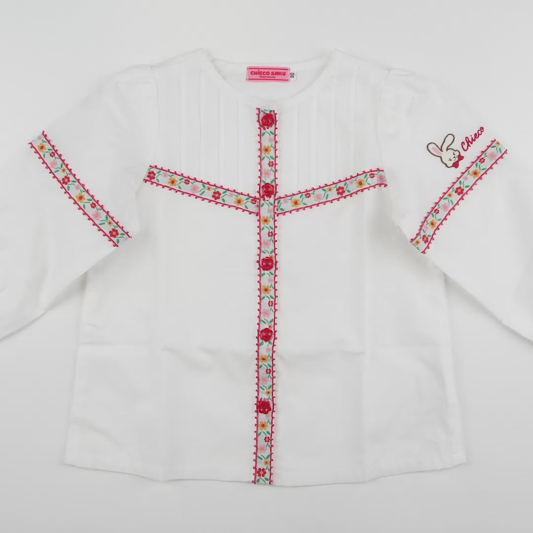 Chieco gathers sweet, imaginary flowers in both hands, bringing them to life with colorful Tirolian tape and retro folk-style detailing. Buttoned flower accents add subtle magic to every movement. Perfect for layering over skirts or jumper dresses, it adds playful flair to any spring outing.