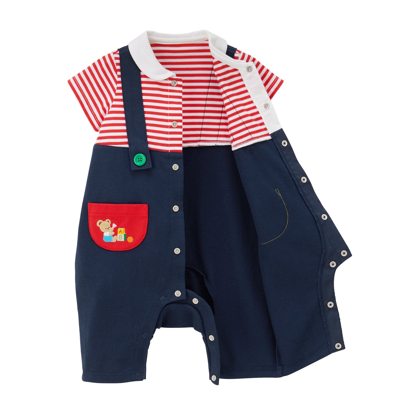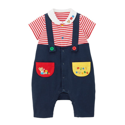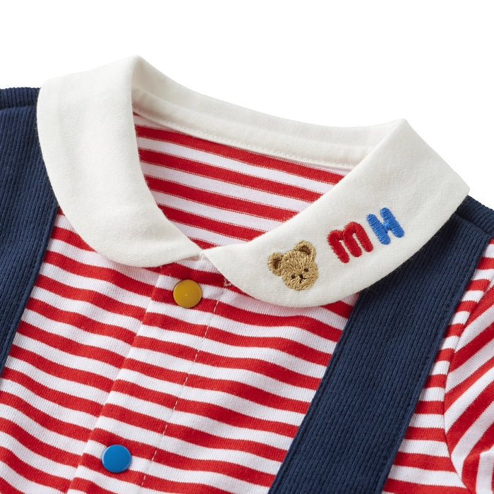 Sun-kissed days call for these blissfully breathable short rompers. Featuring a timeless faux-layered style of overalls over classic red-and-white stripes, the playful embroidery, colorful buttons, and fun pockets add a MIKI HOUSE touch. With the snap crotch buttons and relaxed fit for easy diaper changes, this all-in-one look is the easy choice for family outings, with room to layer for temperature control.