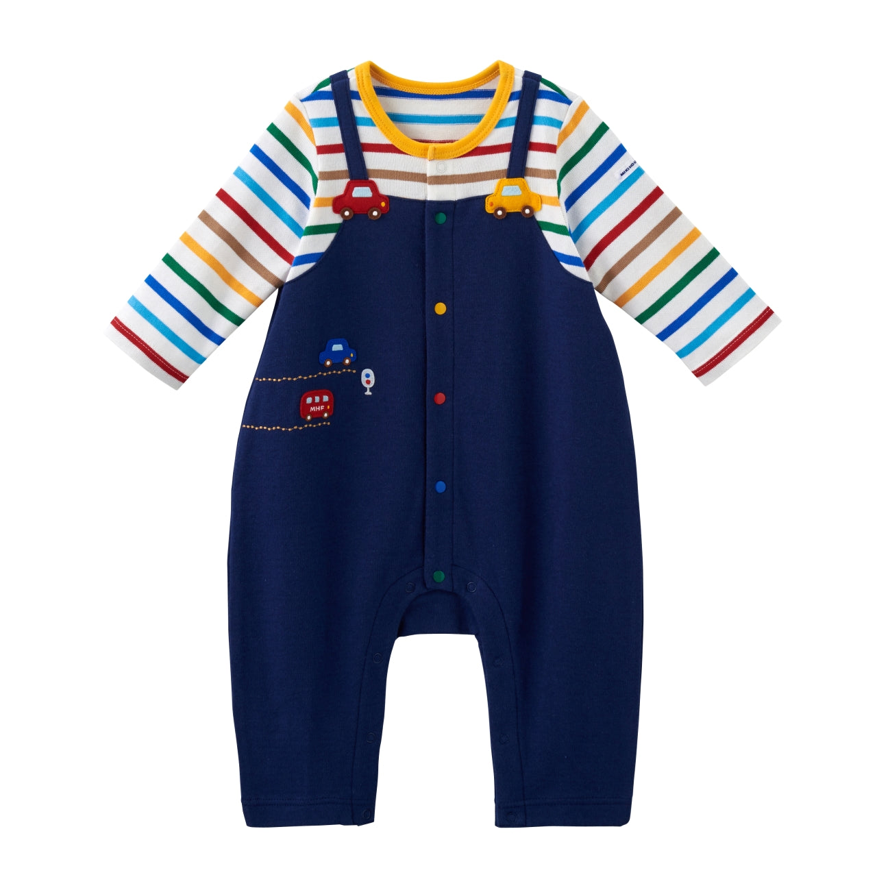 Overall-style coveralls with cute appliqué cars. A popular item that has the look of overalls and the full coverage of coveralls. A perfect newborn gift.