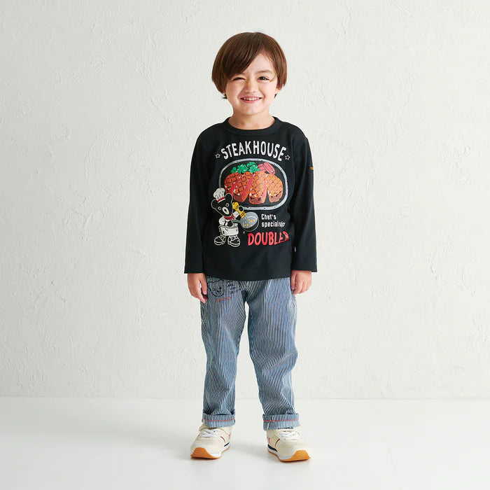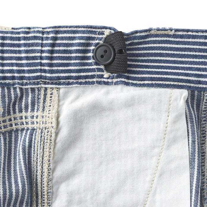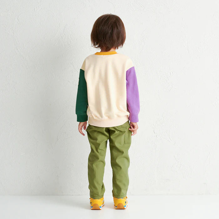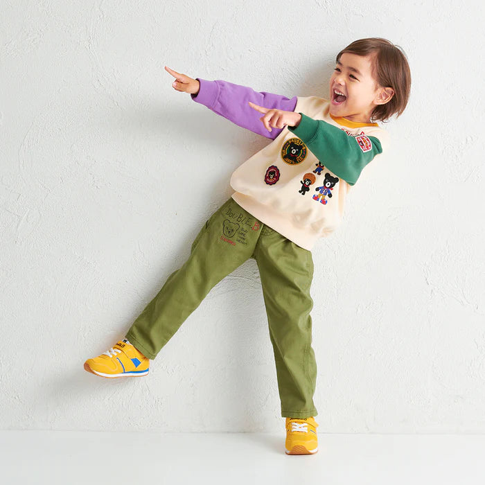 There are no buttons or zippers in MIKI HOUSE Pants. They are designed so that it’s easy to wear and the waistband holds the pants on the waist all the time.