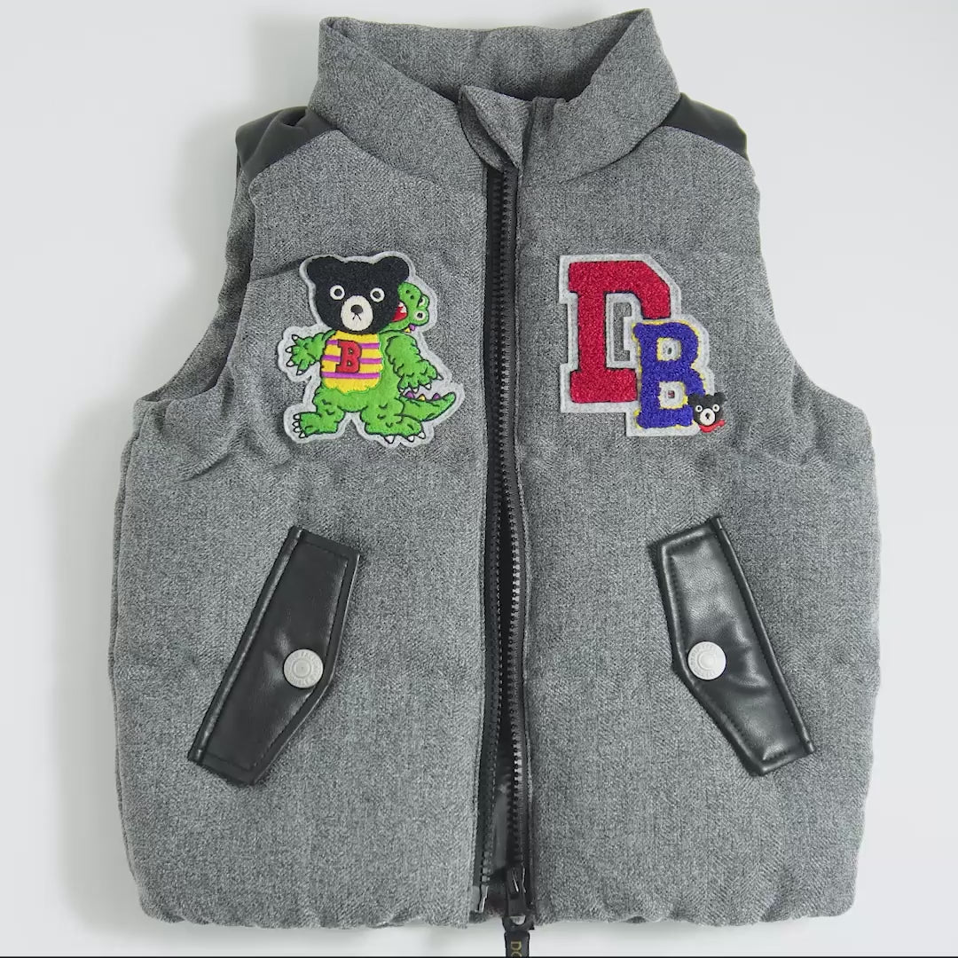 Get ready to stomp into style with this dino-powered down vest from the I Can't Choose Collection. Featuring a rich, intricate embroidery and bold patches, it brings thrilling adventures to life with every wear. The roomy, modern silhouette adds a cool undertone to the tweed-like, wool-touch fabric, while the faux leather accents add a refined yet rugged edge. Perfectly paired with a brushed flannel shirt, it’s the perfect blend of playful and sleek for fall and winter.