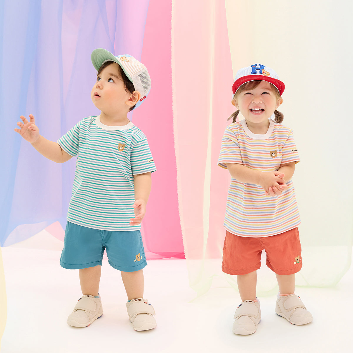 There are no buttons or zippers in MIKI HOUSE Pants. They are designed so that it’s easy to wear and the waistband holds the pants on the waist all the time.