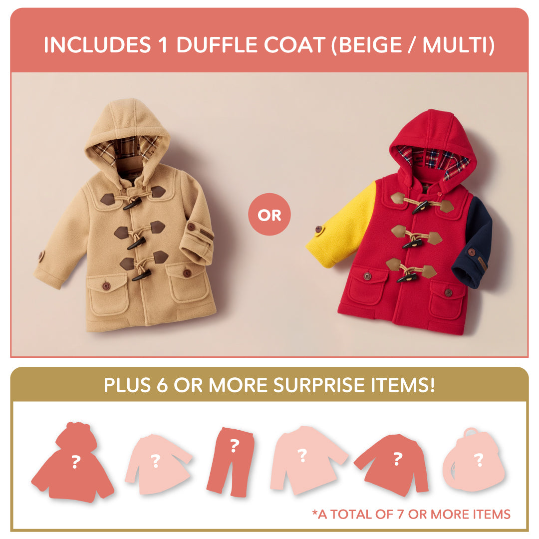 Each bag includes a hand-picked assortment of one fleece duffle coat (Beige or Multi Color) and six or more surprise items. (Approximate total U.S. retail value: $1,500)