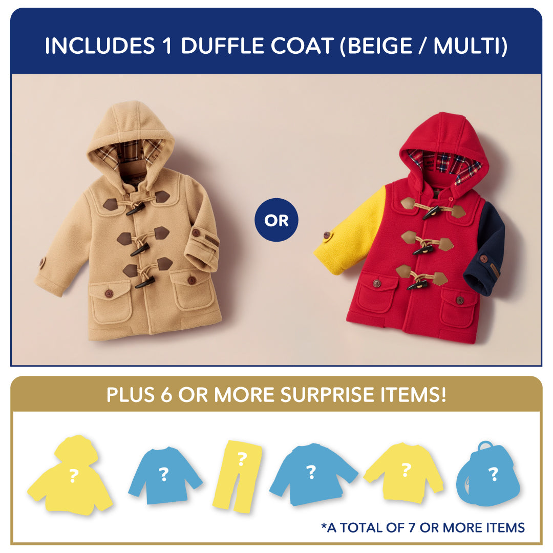 Each bag includes a hand-picked assortment of one fleece duffle coat (Beige or Multi Color) and six or more surprise items. (Approximate total U.S. retail value: $1,500)